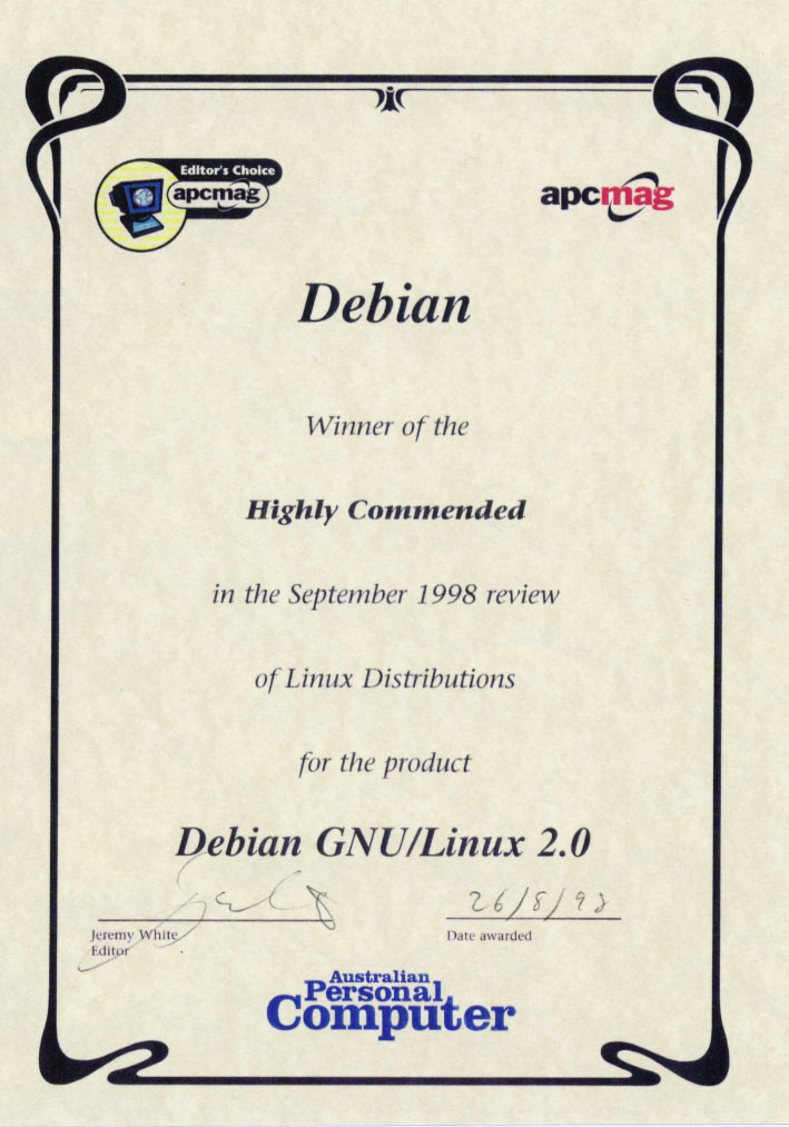 Congratulations on receiving the APC Highly Commended award for Debian GNU/Linux 2.0 in our review of Linux Distributions in the September 1998 edition. We make these awards after extensive testing and review, and the small number of products that receive them are recognised by our readers as being the market leaders and best products and technologies in their class. Regards Helen Duncan New Media Projects Coordinator